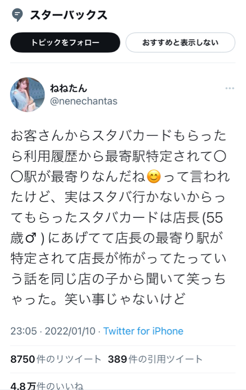 風俗嬢「客からスタバのギフト券は貰わないで!!危険だから!!!」 Twitter Facebook はてブ LINE コピー 2022.01.31 スポンサーリンク 1:風吹けば名無し:2022/01/31(月) 17:55:19.13 ID:1B7Elw7wx.net 2:風吹けば名無し:2022/01/31(月) 17:56:06.47 ID:wbXq7PKsM.net 怖くて草 4:風吹けば名無し:2022/01/31(月) 17:56:43.45 ID:w6h3cwiH0.net ワイも貰ったことあるけどそういうことなんか? 5:風吹けば名無し:2022/01/31(月) 17:56:46.19 ID:nz0DO3Vc0.net へー 続きを読む