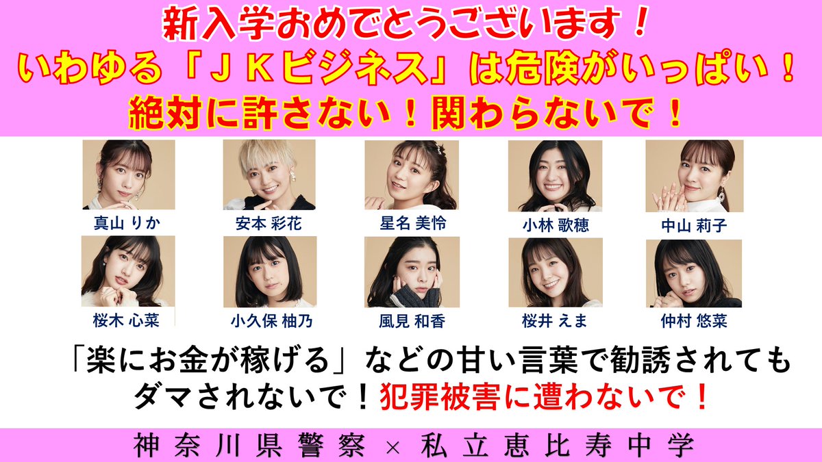 神奈川県警察では、新入学・進学シーズンの4月中、いわゆるJKビジネスに関する若年層の犯罪被害防止のため、県内の企業等に御協力をいただき、デジタルサイネージで注意を呼び掛けます。#防犯#私立恵比寿中学#エビ中 pic.twitter.com/BZnfsHnmzm