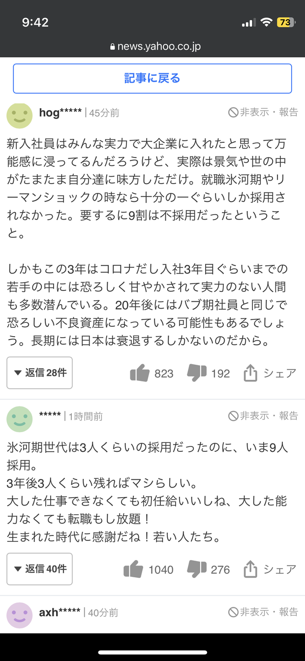 氷河期世代ヤフコメ民が新入社員に正論 「運が良かっただけ」 Twitter Facebook はてブ LINE コピー 2023.04.04 スポンサーリンク 1 : それでも動く名無し :2023/04/04(火) 09:46:44.88 ID:CIG9d2Ucd0404そういう面もあるよな2 : それでも動く名無し :2023/04/04(火) 09:47:08.62 ID:CIG9d2Ucd0404ちなこれ3 : それでも動く名無し :2023/04/04(火) 09:48:58.53 ID:CIG9d2Ucd0404今よりも教育水準も低くて景気も悪くて運もないって氷河期世代は大変やな転載元スレッド:https://nova.5ch.net/test/read.cgi/livegalileo/1680569204/ 続きを読む