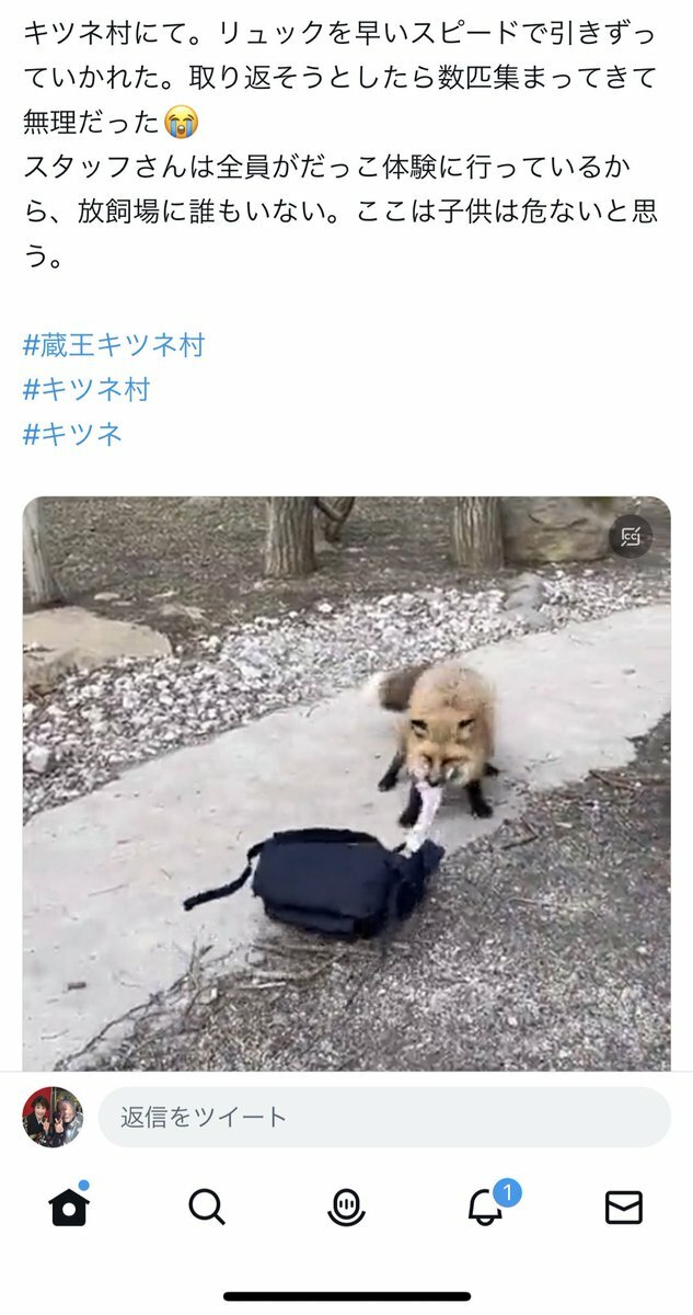 女さんがキツネに荷物を取られた!とTwitterで騒ぐ