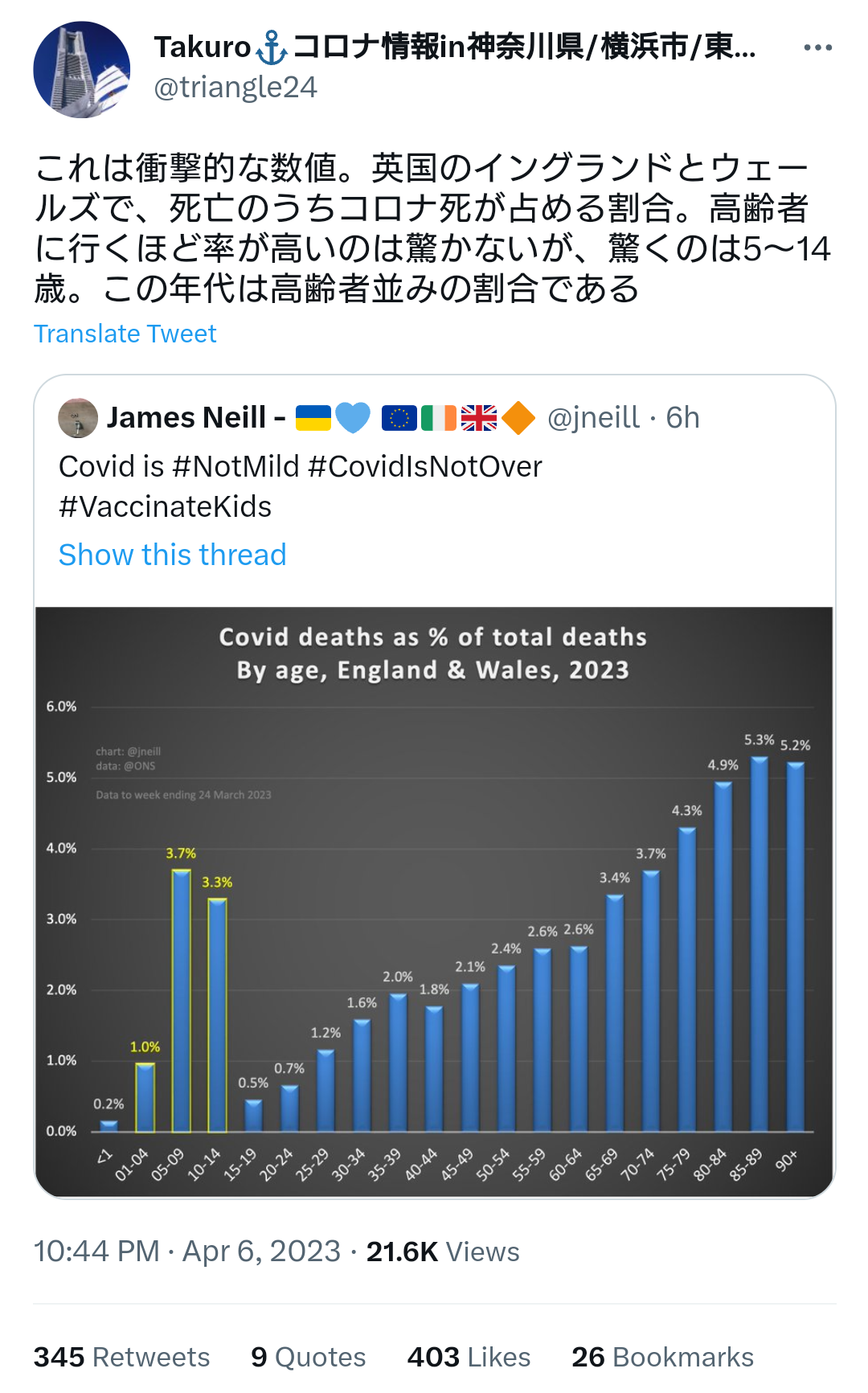 これは衝撃的な数値。英国のイングランドとウェールズで、死亡のうちコロナ死が占める割合。高齢者に行くほど率が高いのは驚かないが、驚くのは5~14歳。この年代は高齢者並みの割合である https://t.co/cSPtDNeif0