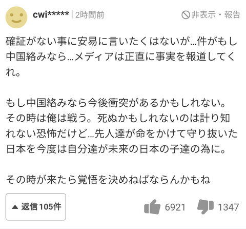 ヤフコメ民「もしヘリ墜落が中国絡みなら、戦う時が来れば俺も”覚悟”を決めるかもしれない」 Twitter Facebook はてブ LINE コピー 2023.04.07 スポンサーリンク 1:風吹けば名無し:2023/04/07(金) 12:51:40.77 ID:bEKBV9Qb0.net 俺も"戦う"から 2:風吹けば名無し:2023/04/07(金) 12:53:04.41 ID:Vo8Wg6fW0.net この人自衛隊なの? 5:風吹けば名無し:2023/04/07(金) 12:53:53.42 ID:Pq6r1K/OM.net 居もしない敵に虚勢を張る虚空しさ 続きを読む