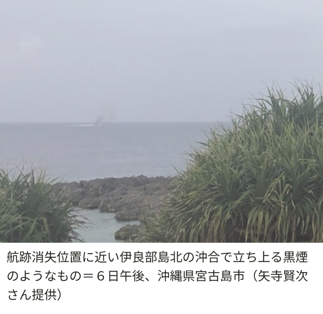 6日午後5時ごろ、伊良部島北端の白鳥岬からサーファーを眺めていた内装業の矢寺賢次さん(46)は、沖合で「5メートル以上あったのでは」という水しぶきが上がるのを見た。クジラだと考え、撮影しようしたところ、黒煙が20分以上立ち上った。