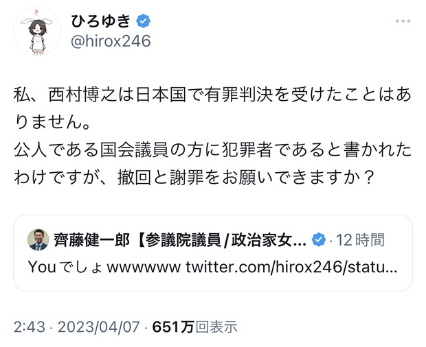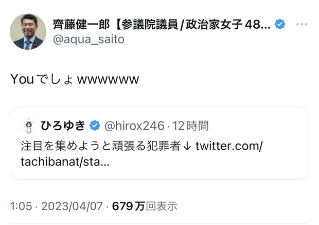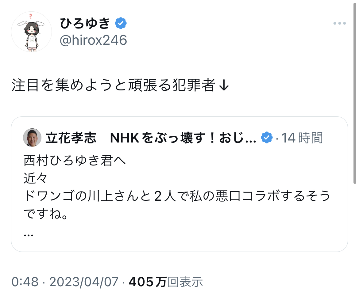 【悲報】ひろゆき、FC2創業者に論破される Twitter Facebook はてブ LINE コピー 2023.04.08 スポンサーリンク 1 : それでも動く名無し :2023/04/07(金) 22:16:25.61 ID:TVXhhdwIaひろゆき、立花に対談しろと言われ犯罪者と煽る↓N党議員がひろゆきに「youでしょ」と煽る↓ひろゆき「有罪判決受けたことないから犯罪者じゃありません」↓FC2創業者「有罪判決受けてないガーシーを犯罪者と言ってたよね?」過去ツイート以降、ひろゆきだんまり転載元スレッド:https://nova.5ch.net/test/read.cgi/livegalileo/1680873385/ 続きを読む