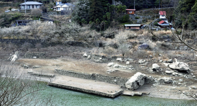 愛媛県四国中央市新宮町の新宮ダムで、渇水のためダム湖の水位が下がり、50年近く前に湖底へ沈んだ民家の石垣などが姿を現した。新居浜市の別子銅山跡が「東洋のマチュピチュ」と呼ばれるのに対し、幻想的な風景は地元で「湖底のマチュピチュ」として知られる。