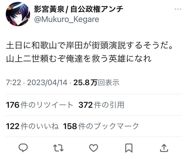 【悲報】Twitter民「岸田が演説か、第二の山上頼むでー」 → テロ後、鍵垢に Twitter Facebook はてブ LINE コピー 2023.04.16 スポンサーリンク 1 : それでも動く名無し :2023/04/15(土) 19:19:09.21 ID:hk1MBzOnMおまわりさんこのひとです↓2 : それでも動く名無し :2023/04/15(土) 19:19:26.46 ID:hk1MBzOnM3 : それでも動く名無し :2023/04/15(土) 19:19:52.75 ID:iiupauhEa草転載元スレッド:https://nova.5ch.net/test/read.cgi/livegalileo/1681553949/ 続きを読む