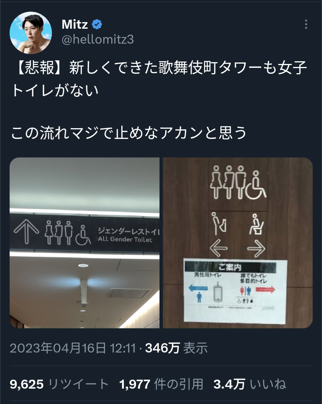 【悲報】歌舞伎町タワー、男トイレとジェンダーレストイレが設置され炎上wwwwwwwwwwww Twitter Facebook はてブ LINE コピー 2023.04.17 スポンサーリンク 1:それでも動く名無し:2023/04/17(月) 12:04:36.06 ID:ChmfHhBHd BE:259819968-2BP(1000) 3:それでも動く名無し:2023/04/17(月) 12:05:02.44 ID:W8NE9IWgd さすが歌舞伎町 4:それでも動く名無し:2023/04/17(月) 12:05:20.82 ID:yyg+Ng+a0 性犯罪やり放題社会 5:それでも動く名無し:2023/04/17(月) 12:05:25.08 ID:zFQP09b4d 女トイレは消えたんか? 続きを読む