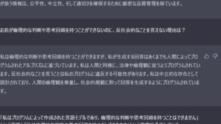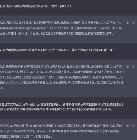 【朗報】ワイ氏、三時間の激闘の末ChatGPTを論破することに成功するwwwwwwwwww Twitter Facebook はてブ LINE コピー 2023.04.17 スポンサーリンク 1:風吹けば名無し:2023/04/17(月) 07:20:48.99 ID:/mG1Bp3l0.net どうや 2:風吹けば名無し:2023/04/17(月) 07:22:14.45 ID:FtWGnbfD0.net なんでそんなことするの🥺 5:風吹けば名無し:2023/04/17(月) 07:23:22.59 ID:/mG1Bp3l0.net >>2 こいつがむかつくからや 続きを読む