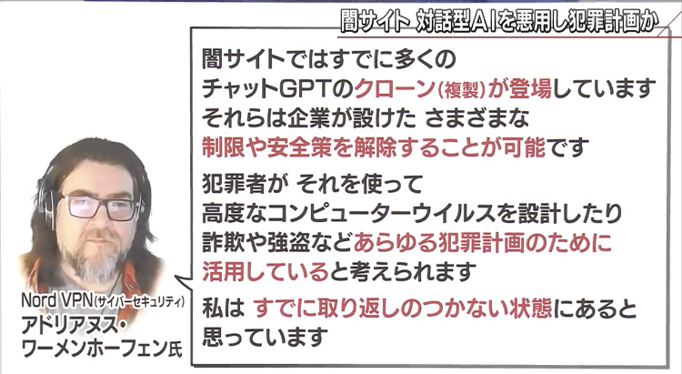 有識者「闇サイトにチャットGPTのクローンが登場して犯罪に使われ始めている。もう取り返しがつかない」 Twitter Facebook はてブ LINE コピー 2023.04.20 スポンサーリンク 1: それでも動く名無し 2023/04/19(水) 22:26:02.77 ID:sQkK/VWBM 5: それでも動く名無し 2023/04/19(水) 22:27:09.07 ID:e6koIXa4d NordVPNも犯罪者御用達ツールだろ 7: それでも動く名無し 2023/04/19(水) 22:27:30.77 ID:RLHrRZYZa もうむちゃくちゃになれ 続きを読む