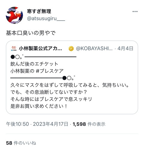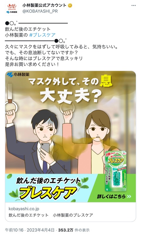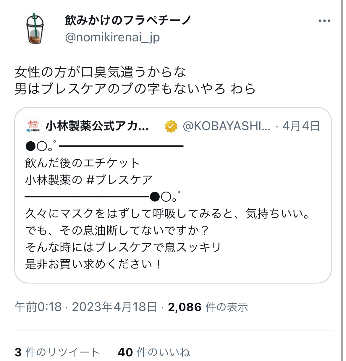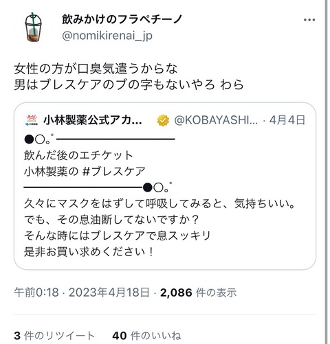 【画像】女子、小林製薬にブチギレwwwwwwwwwww Twitter Facebook はてブ LINE コピー 2023.04.20 スポンサーリンク 1:以下、?ちゃんねるからVIPがお送りします:2023/04/19(水) 12:32:23.215 2:以下、?ちゃんねるからVIPがお送りします:2023/04/19(水) 12:33:04.129 うわぁ…典型的なクレーマーだ… 5:以下、?ちゃんねるからVIPがお送りします:2023/04/19(水) 12:33:29.065 いつも臭い男を広告にしても効果に乏しいだろ 続きを読む