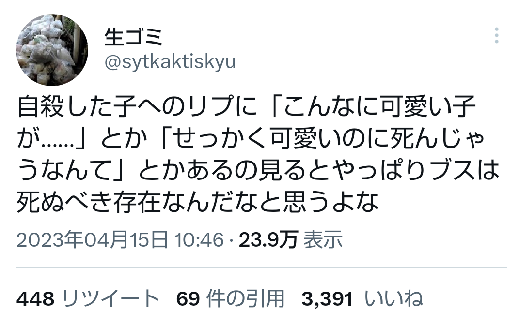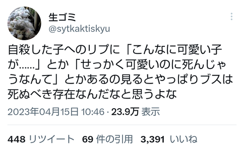 【ギャオ】フェミ「JKが自殺すると可愛いのにと惜しまれる。つまりブスは死ねってこと!?」23万いいね Twitter Facebook はてブ LINE コピー 2023.04.20 スポンサーリンク 1:それでも動く名無し:2023/04/19(水) 16:49:11.75 ID:dbYXWCpa0 5:それでも動く名無し:2023/04/19(水) 16:50:02.83 ID:Os4C5Gjl0 そうだよ 6:それでも動く名無し:2023/04/19(水) 16:50:06.51 ID:mcl21XE00 正論 続きを読む