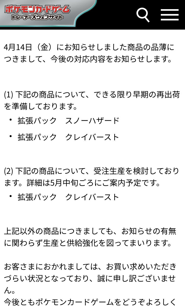 【朗報】ポケモンカード、「クレイバースト(ナンジャモ入ってるやつ)」受注生産へ Twitter Facebook はてブ LINE コピー 2023.04.21 スポンサーリンク 1: それでも動く名無し 2023/04/21(金) 14:07:17.27 ID:xEHVJPJN0 https://www.pokemon-card.com/info/003915.html 4: それでも動く名無し 2023/04/21(金) 14:10:22.98 ID:JQGoNgcD0 ナンジャモ初動で売り抜けたやつの勝ちか? また狼狽売り始まりそうやな 9: それでも動く名無し 2023/04/21(金) 14:13:42.72 ID:T4o0b6Fad ナンジャモ大暴落の時間ダァ🤪 続きを読む