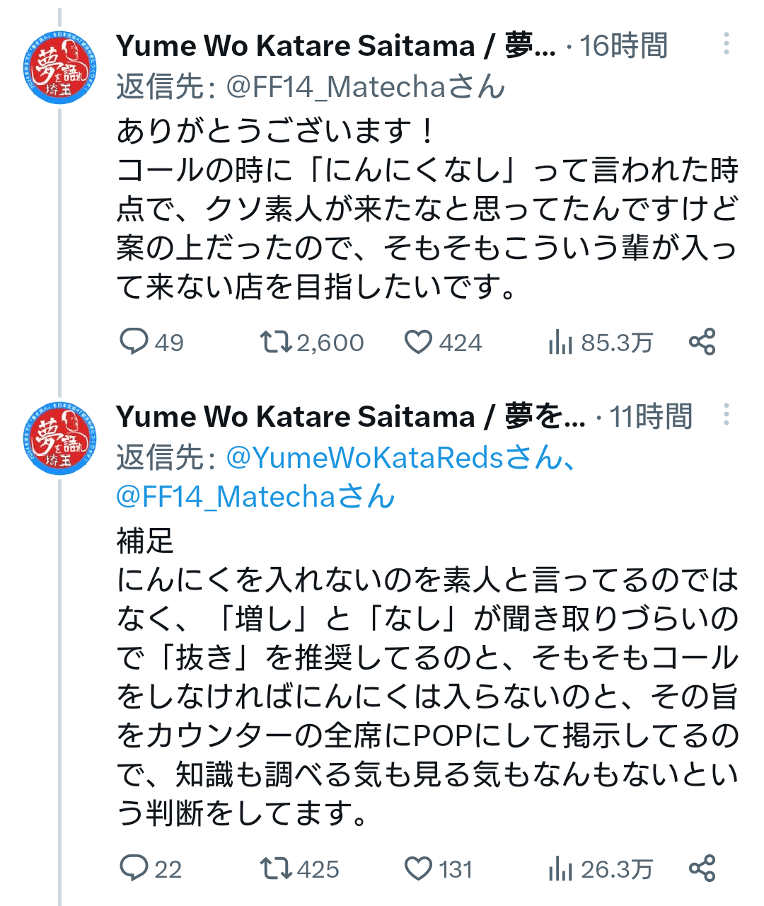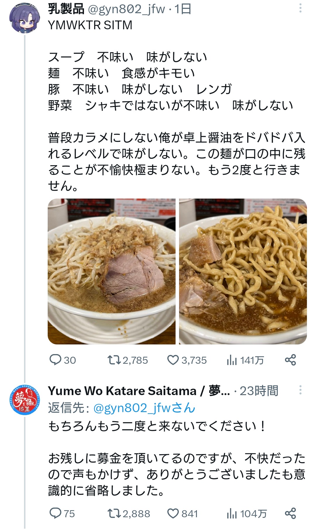 【悲報】ラーメン屋さん、Twitterで批判されてブチギレ Twitter Facebook はてブ LINE コピー 2023.04.23 スポンサーリンク 1: それでも動く名無し 2023/04/22(土) 22:36:02.30 ID:6h/Nzd1GM ヒエ~~ッwww https://twitter.com/YumeWoKataReds/status/1649513424093847553 18: それでも動く名無し 2023/04/22(土) 22:40:22.87 ID:YQ6afvbdM 効きすぎだろ 21: それでも動く名無し 2023/04/22(土) 22:40:52.16 ID:+n+fXm680 同じレベルじゃないと争いは起きない 続きを読む