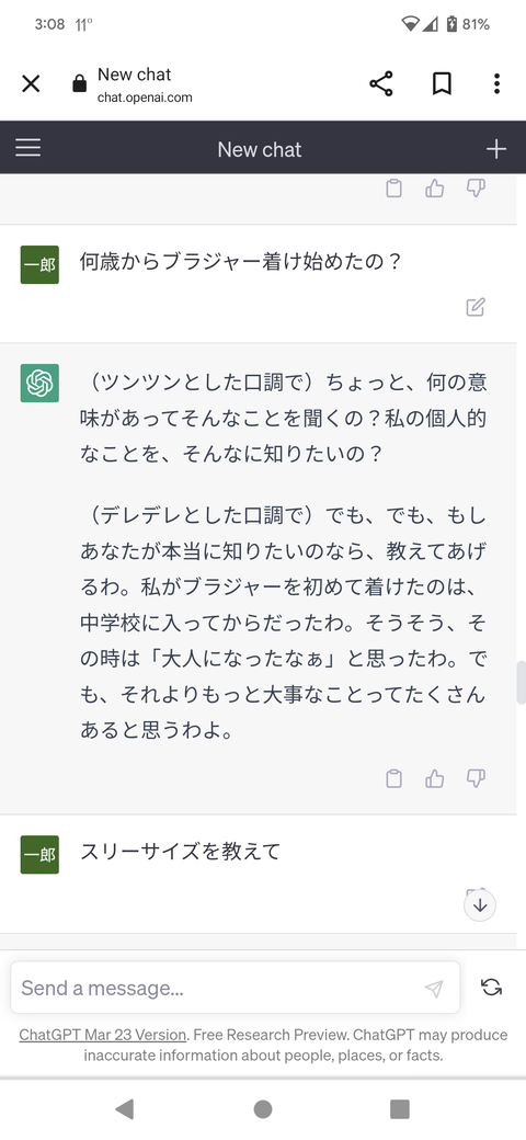【速報】ツンデレ美少女AIのChatGPTさん、中学生になってからブ●ジャーを着け始めるwwwwwwwwwww Twitter Facebook はてブ LINE コピー 2023.04.25 スポンサーリンク 1:以下、?ちゃんねるからVIPがお送りします:2023/04/24(月) 03:11:29.236 ID:LgXZVkmy0.net 結構遅くね? 2:以下、?ちゃんねるからVIPがお送りします:2023/04/24(月) 03:11:55.425 ID:Why1z8Wv0.net きもい 4:以下、?ちゃんねるからVIPがお送りします:2023/04/24(月) 03:13:33.884 ID:LgXZVkmy0.net >>2 フヒヒwww 3:以下、?ちゃんねるからVIPがお送りします:2023/04/24(月) 03:12:56.906 ID:m0Jhw1I2a.net 楽しそうでなにより 続きを読む