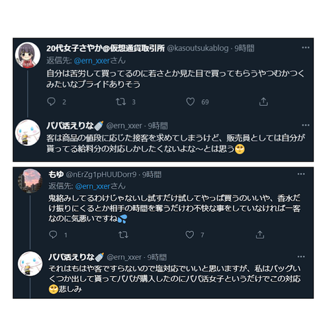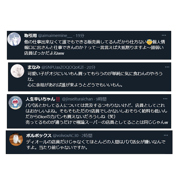 ディオールの店員さんってp活女子のことめちゃ嫌いだよね??パパの前でわざと名前読み上げてきたり分かってるのに敢えてパパにお父様ですか?って聞いてきて違うって答えたら、あぁ笑最近多いんですよ?笑??とか言ってきた。1人で行ったときも自分で買うんですか?笑とか言われた??もっと言い方あるやろ