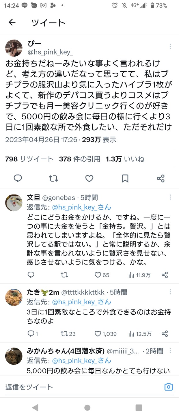 お金持ちだねーみたいな事よく言われるけど、考え方の違いだなって思ってて、私はプチプラの服沢山より気に入ったハイブラ1枚がよくて、新作のデパコス買うよりコスメはプチプラでも月一美容クリニック行くのが好きで、5000円の飲み会に毎日の様に行くより3日に1回素敵な所で外食したい、ただそれだけ