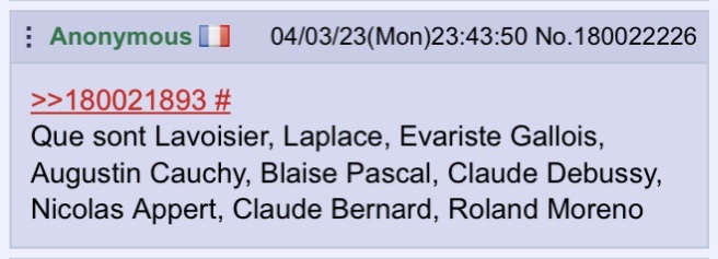 日本人「フランスってデカルト以外に偉人いるの?w」 フランス人「許せん!俺たちの偉人見せたる!」 Twitter Facebook はてブ LINE コピー 2023.05.01 スポンサーリンク 1 : それでも動く名無し :2023/04/04(火) 07:21:33.98 ID:NmK/5Se9M0404ラヴォアジエ、ラプラス、ガロワ、コーシー、パスカル、ドビュッシー、アペール、ベルナール、モレーノうーん…2 : それでも動く名無し :2023/04/04(火) 07:21:42.19 ID:NmK/5Se9M0404ぶっちゃけ微妙…か…?転載元スレッド:https://nova.5ch.net/test/read.cgi/livegalileo/1680560493/ 続きを読む