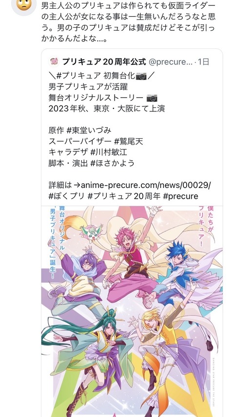 女性さん、怒りの正論「男プリキュアやるなら全員女の仮面ライダーも作ってよ!不公平でしょ!」 Twitter Facebook はてブ LINE コピー 2023.05.01 スポンサーリンク 1:風吹けば名無し:2023/05/01(月) 13:59:32.38 ID:CgN16hoJ0.net 3:風吹けば名無し:2023/05/01(月) 14:00:35.76 ID:pxx94aWca.net これまでもメインじゃないけど女ライダーは居たんやし そろそろええんちゃうか? 続きを読む