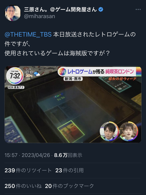 【悲報】テレビ「今レトロゲームが人気です」←海賊版だったことが判明して炎上wwwwwwwwwwwww Twitter Facebook はてブ LINE コピー 2023.05.01 スポンサーリンク 1:以下、?ちゃんねるからVIPがお送りします:2023/05/01(月) 12:18:16.090 まあ現存する正規筐体なんて綺麗な状態で残ってるわけないわな 3:以下、?ちゃんねるからVIPがお送りします:2023/05/01(月) 12:19:18.632 わかるか!こんなもん 5:以下、?ちゃんねるからVIPがお送りします:2023/05/01(月) 12:19:22.380 そもそも人気じゃない 6:以下、?ちゃんねるからVIPがお送りします:2023/05/01(月) 12:19:50.011 これはこれで古いものじゃねぇ? 続きを読む