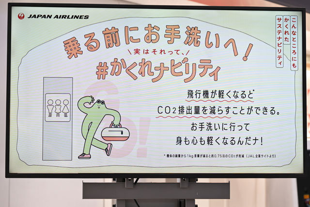 日本航空(JAL/JL、9201)は4月26日、飛行機を使った移動でサステナビリティについて知ってもらおうと、「かくれナビリティ」をキーワードにした動画の放映を始めた。例えば、搭乗前にトイレで用を足すことで一人あたりの重量が軽くなるという。