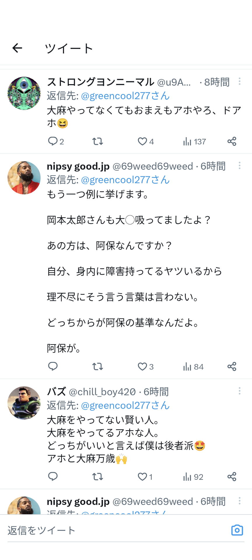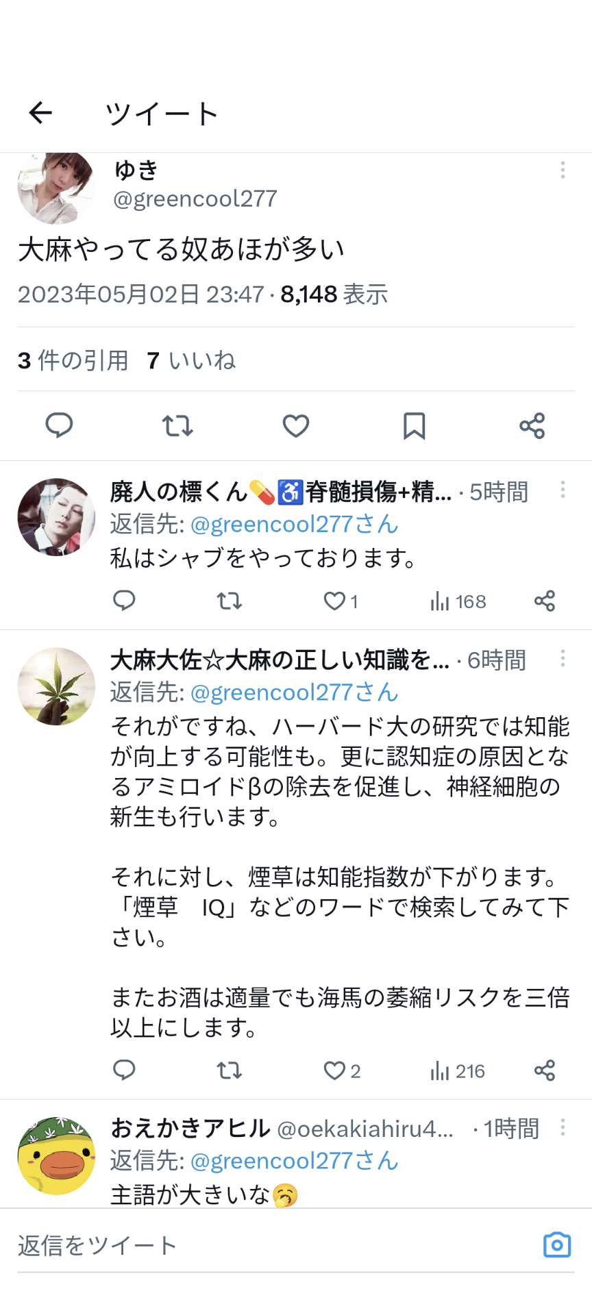 【戦慄】ツイッターで「大麻」を批判するとこうなるwwwwwwww Twitter Facebook はてブ LINE コピー 2023.05.03 スポンサーリンク 1:以下、?ちゃんねるからVIPがお送りします:2023/05/03(水) 16:39:24.751 ID:i7umQNnua.net こわ 2:以下、?ちゃんねるからVIPがお送りします:2023/05/03(水) 16:40:18.139 ID:XBctlylq0.net 逆張りくんは実はTwitterのほうが多い 4:以下、?ちゃんねるからVIPがお送りします:2023/05/03(水) 16:41:51.976 ID:xWOUkK530.net 脳死で批判してりゃそうなる 続きを読む