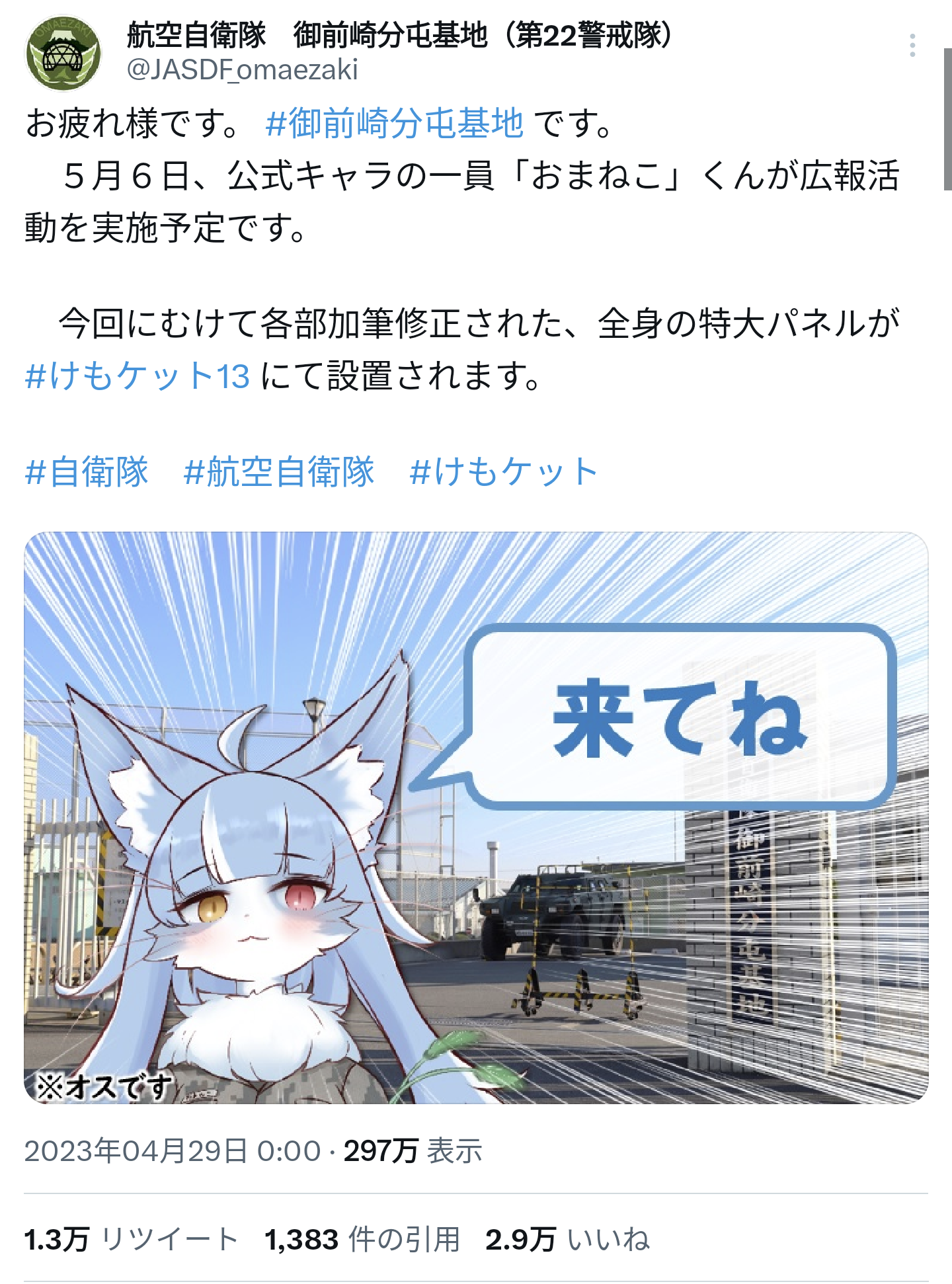 【画像】航空自衛隊の公式キャラクターがエッチすぎると話題にwwwwwwwwwwwwwww Twitter Facebook はてブ LINE コピー 2023.05.05 スポンサーリンク 1:風吹けば名無し:2023/05/05(金) 17:06:39.70 ID:d/zXcsZ500505.net 2:風吹けば名無し:2023/05/05(金) 17:07:07.57 ID:v7PVlvSUM0505.net ♂にするから... 3:風吹けば名無し:2023/05/05(金) 17:07:19.47 ID:CSXgEW8L00505.net ふーん 続きを読む