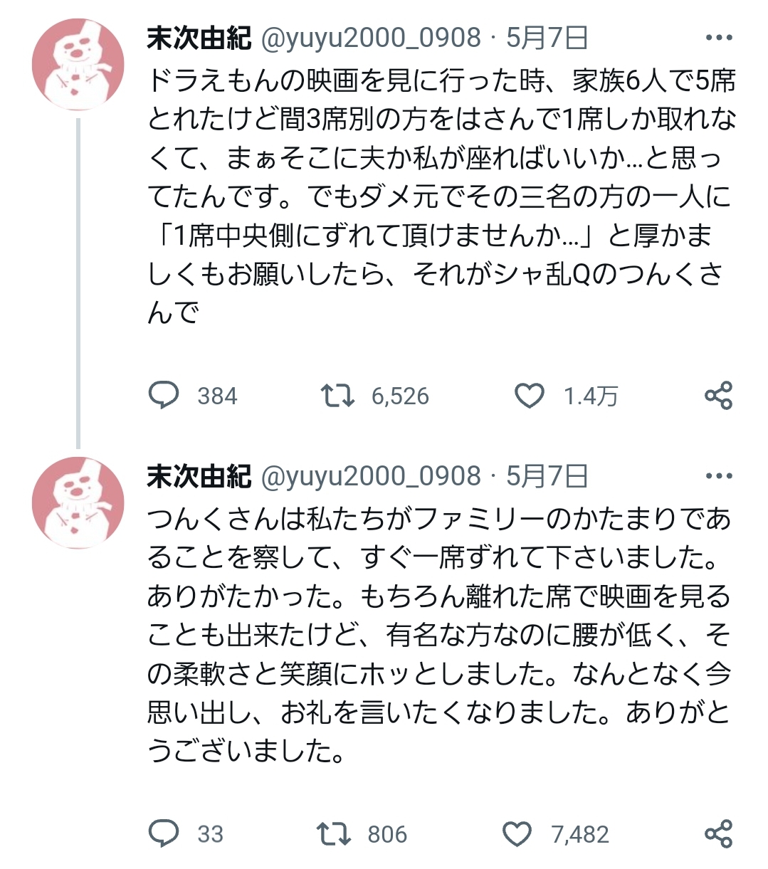 つんく♂さんの人柄を感じるほっこりエピソードだとする意見も多い一方で、SNSでは思わぬ方向で議論が巻き起こった。事前に予約できる映画館の座席を上映前に代わってもらうのはマナー違反ではないか、とするものだ。上映中の気まずさなどを考慮すると、「お願い」を断るのは難しいのではないかとする声もある。