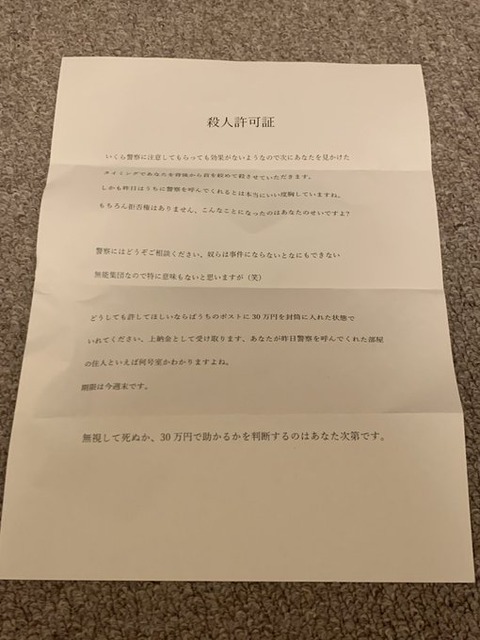殺人予告ではなく許可証ってところがイっちゃってるホンモノ感あるわ