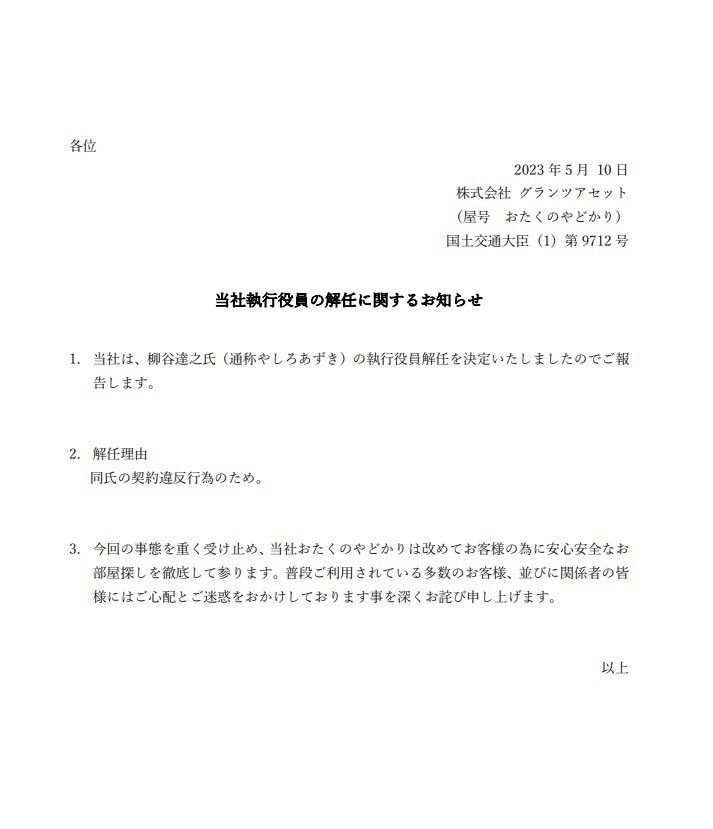 不動産会社「おたくのやどかり」を運営するグランツアセットは、同氏の執行役員解任を決定。理由は「同氏の契約違反行為のため」としている。やしろ氏を巡っては、SNS上で不祥事に関する情報などが拡散されていた。 pic.twitter.com/FYdHe4miQQ