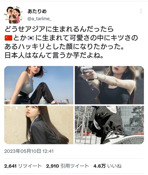 【画像】 ツイッター女性 「どうせアジアに生まれるなら中韓が良かった。日本人は芋」 →5万いいね Twitter Facebook はてブ LINE コピー 2023.05.11 スポンサーリンク 1::2023/05/11(木) 13:12:21.68 0 BE:354026492-2BP(2000).net どうせアジアに生まれるんだったら ????とか????に生まれて可愛さの中にキツさのあるハッキリとした顔になりたかった。 日本人はなんて言うか芋だよね。 続きを読む