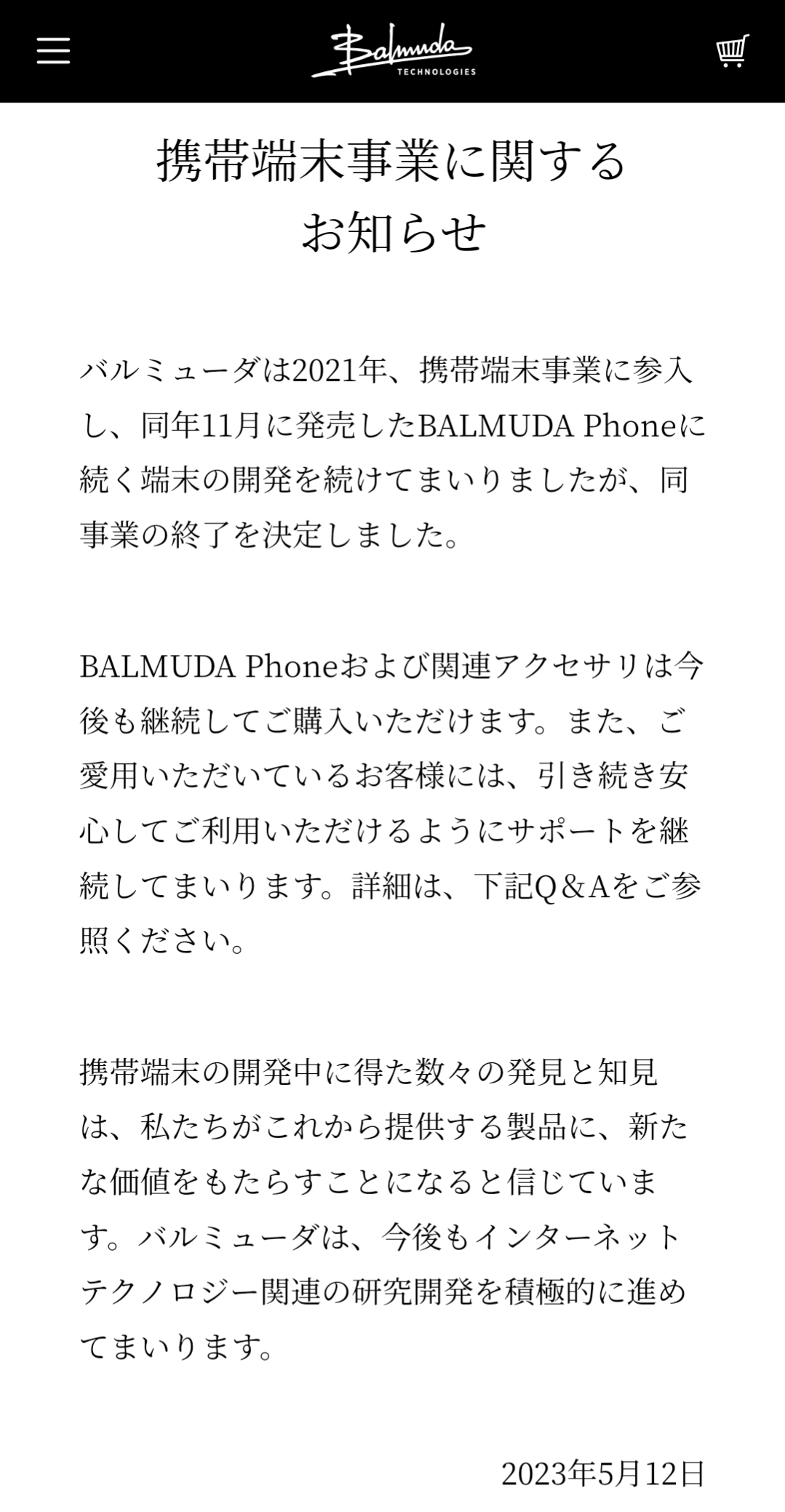 携帯端末事業に関するお知らせ|BALMUDA Technologies