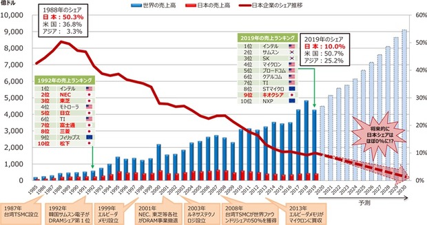 最後に、ICT製品製造に必要な部品の代表例として、「産業のコメ」とも呼ばれ、様々な産業で利用される半導体を取り上げる。我が国半導体産業の世界におけるシェアは、1988年は50.3%であったが、1990年代以降、徐々にその地位を低下させ、2019年には10.0%にとどまっている(図表0-2-1-3)。