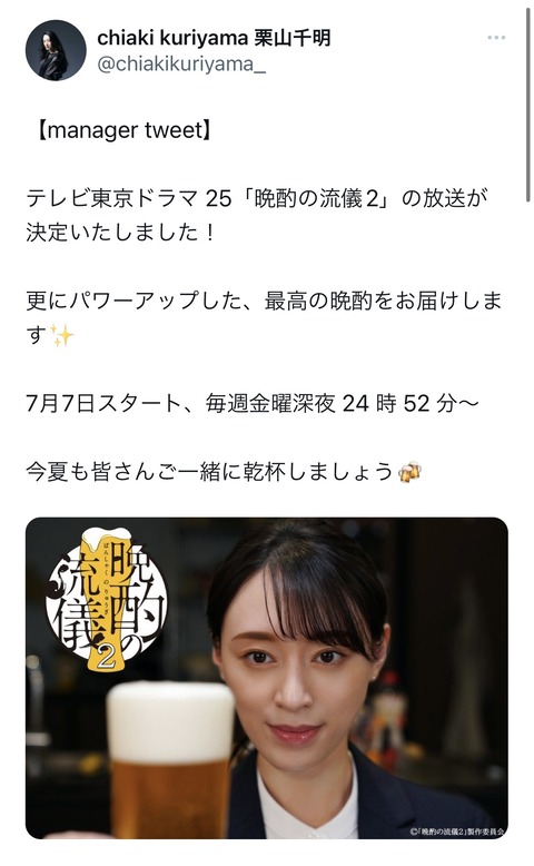 シーズン2の放送が決定したことを受け、栗山は自身のツイッターを更新。「グレードアップした美幸の日常を、そして最高の晩酌を皆さまにお届けできたらうれしいです。ぜひご覧頂き、よろしければご一緒に、最高の晩酌タイムを過ごしましょう!」と呼びかけたが…。