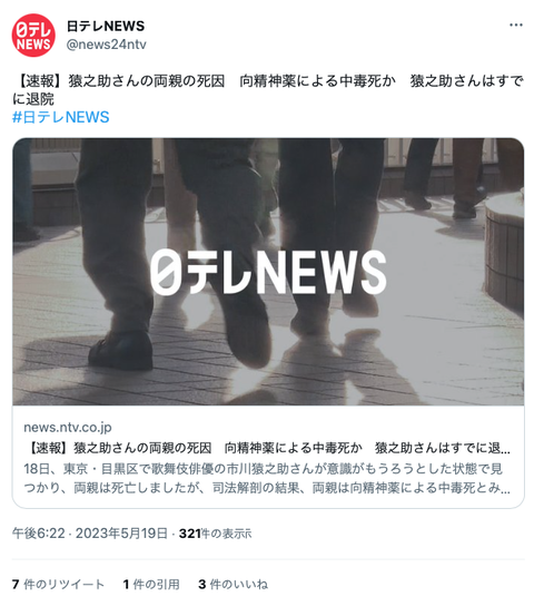 【速報】猿之助、退院 Twitter Facebook はてブ LINE コピー 2023.05.19 スポンサーリンク 1:それでも動く名無し:2023/05/19(金) 18:24:20.31 ID:eVZJNYB70 4:それでも動く名無し:2023/05/19(金) 18:26:38.10 ID:m8z6kGfha 向精神薬ってヤバいんやな 気を付けよう 7:それでも動く名無し:2023/05/19(金) 18:28:03.27 ID:LJnWOhQ50 え早ない? 続きを読む