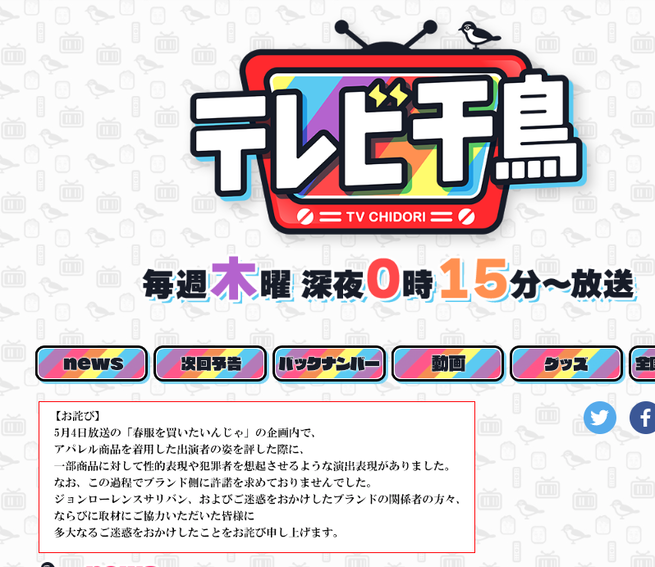 「アパレル商品を着用した出演者の姿を評した際に、一部商品に対して性的表現や犯罪者を想起させるような演出表現がありました」と公式サイトで謝罪した。 pic.twitter.com/BAEoJurt7s