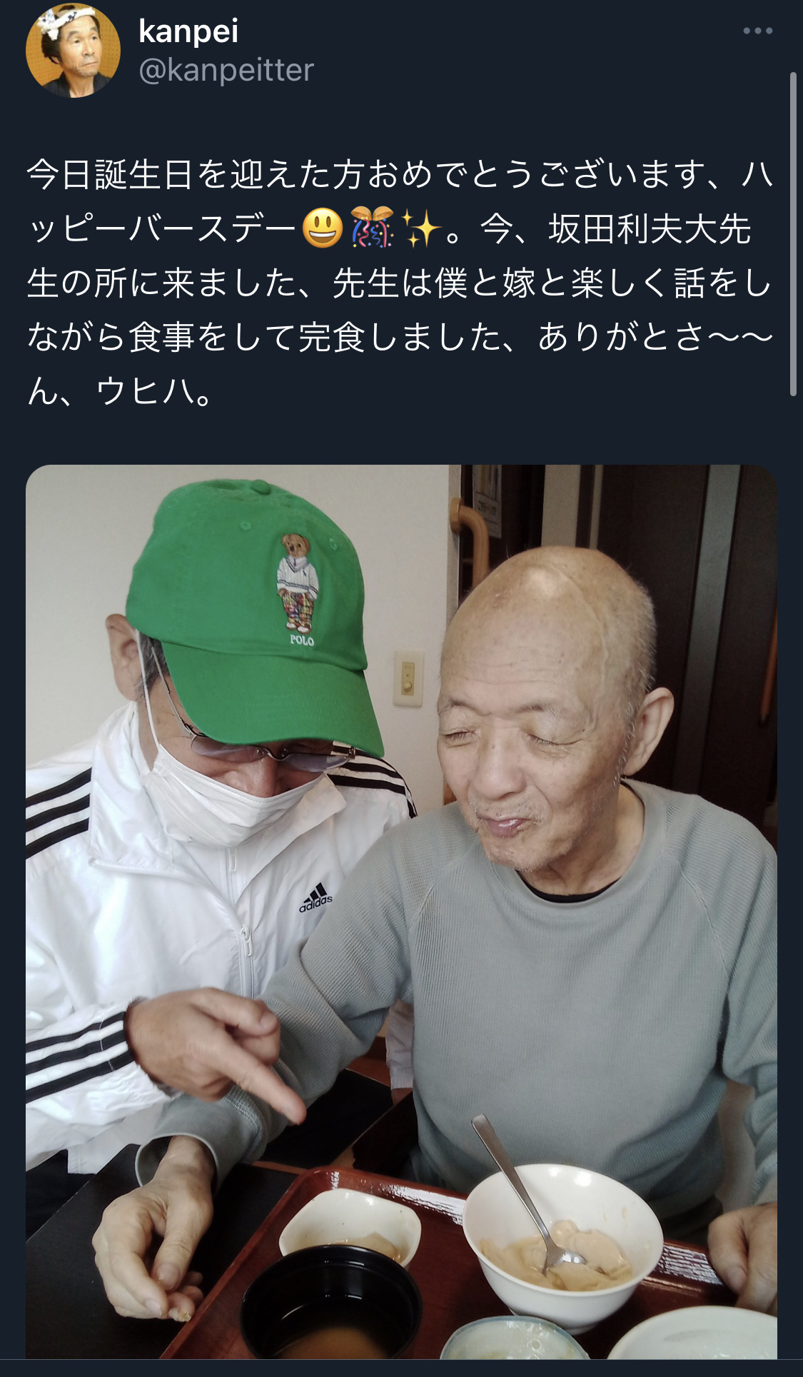 今日誕生日を迎えた方おめでとうございます、ハッピーバースデー😃🎊✨。今、坂田利夫大先生の所に来ました、先生は僕と嫁と楽しく話をしながら食事をして完食しました、ありがとさ~~ん、ウヒハ。 pic.twitter.com/G3xwic9cBL