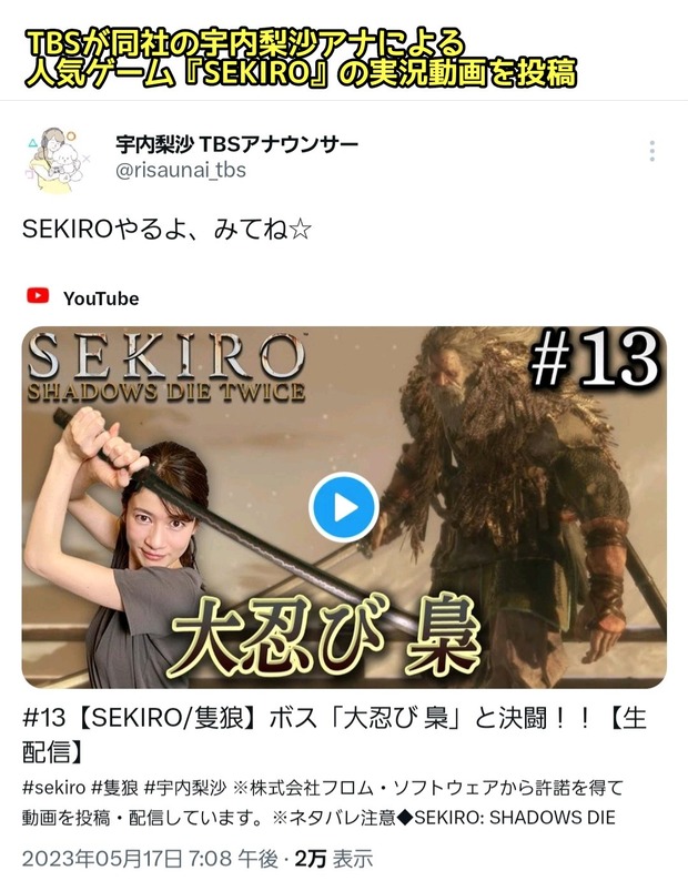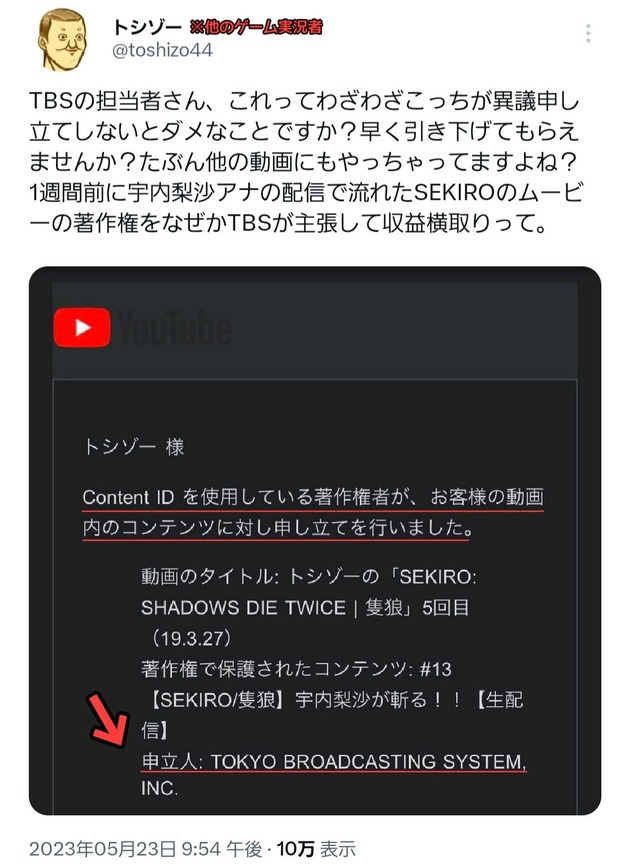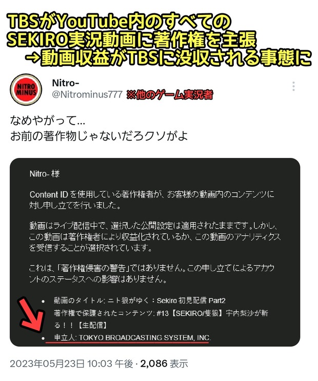 TBS様、You Tube内の全てのSEKIRO実況を著作権違反として収益横取り