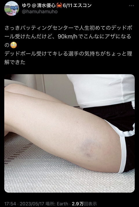 【画像】女の子「デッドボールは90キロでもアザできちゃうんだよ?」🥺パシャ