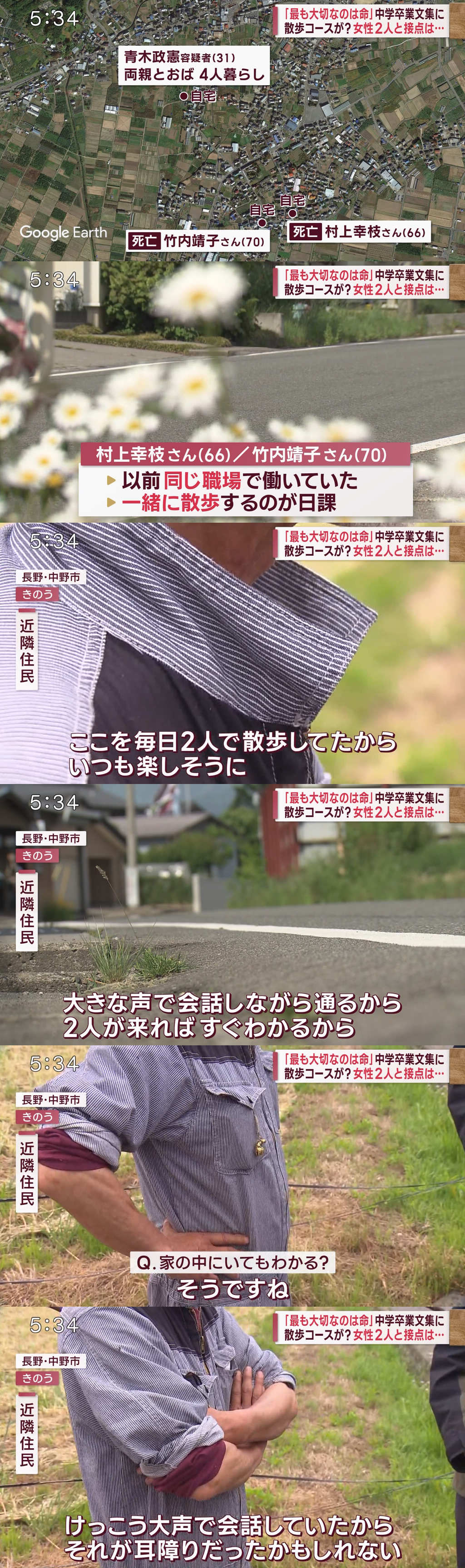 長野被害女性、毎日青木家宅の前を大きな声で談笑しながら散歩していた Twitter Facebook はてブ LINE コピー 2023.05.28 スポンサーリンク 1: それでも動く名無し 2023/05/28(日) 09:26:01.55 ID:QhCbYdrLp 6: それでも動く名無し 2023/05/28(日) 09:29:10.72 ID:Qzw3NhhmM 何言ってたかによるわな 8: それでも動く名無し 2023/05/28(日) 09:29:39.48 ID:4JBeGMC8d どんだけ大声で話してたんだよ 続きを読む
