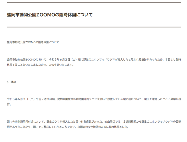 岩手県の盛岡市動物公園=ZOOMOは3日、園内にクマが侵入した可能性が高いとして、安全確保のため臨時休園としました。