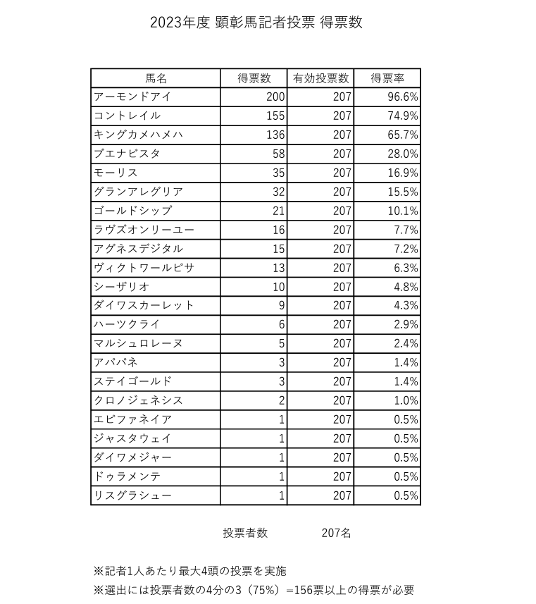 コントレイルは155票。選定要件の156票に1票及ばず。#アーモンドアイ #コントレイル