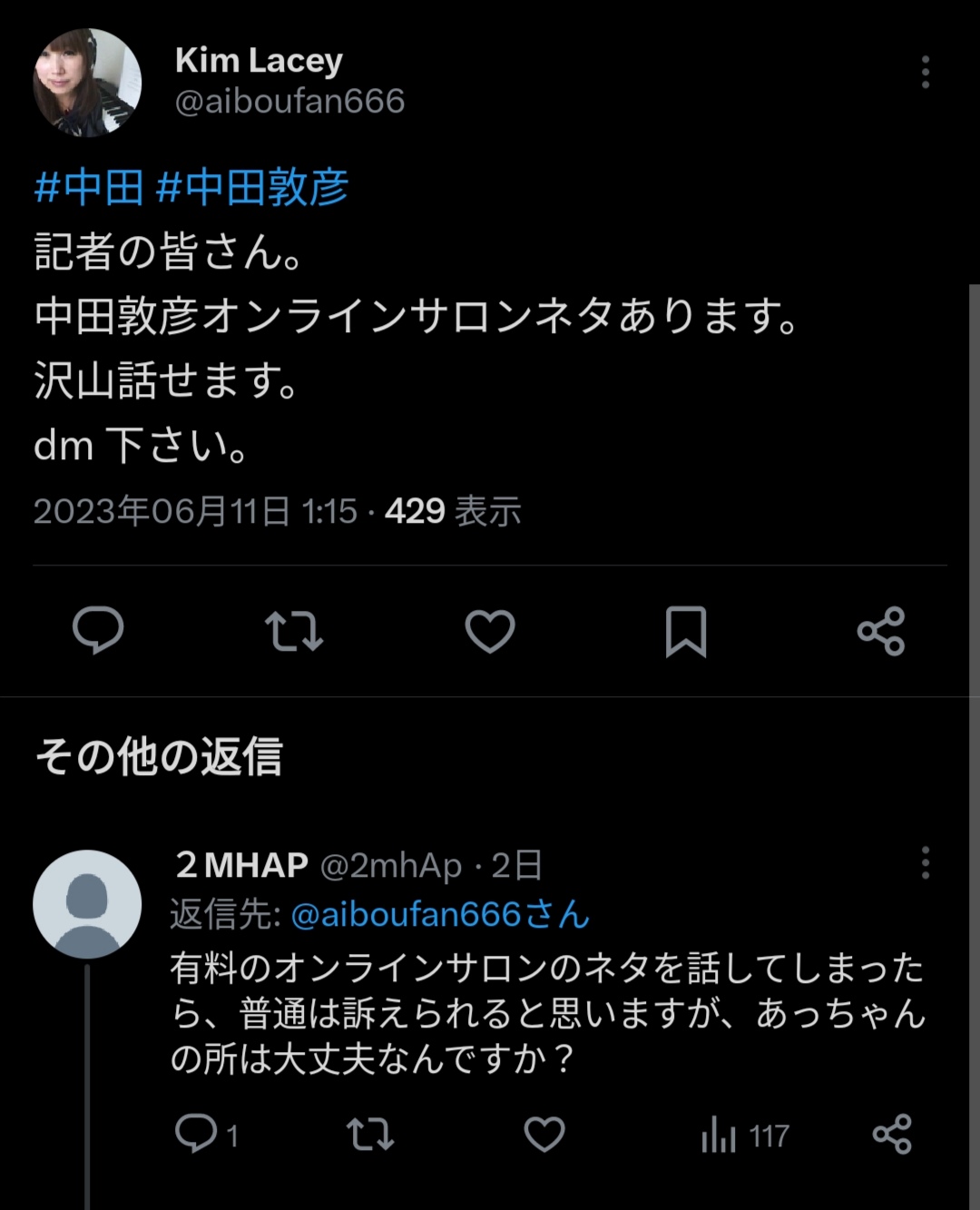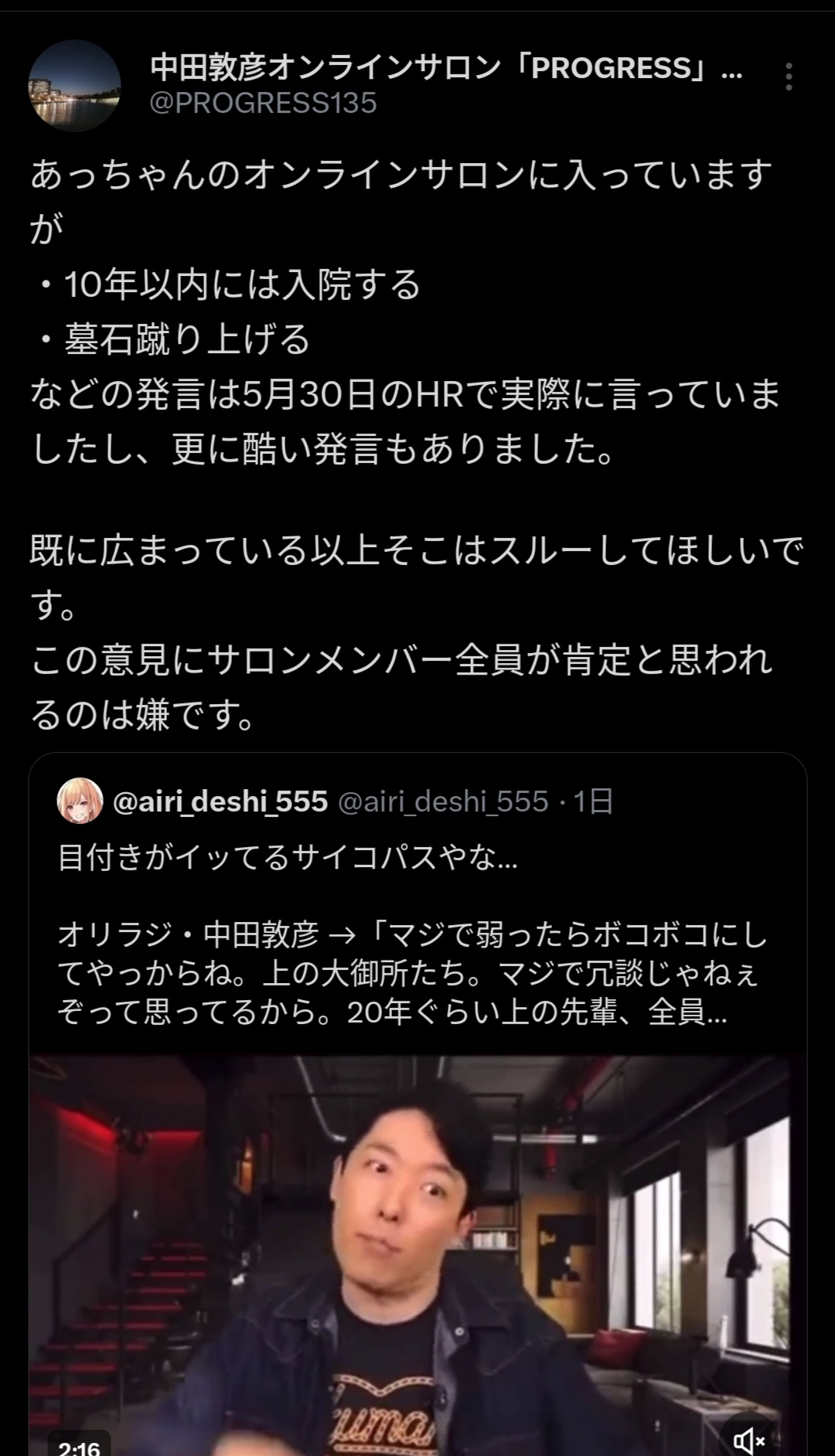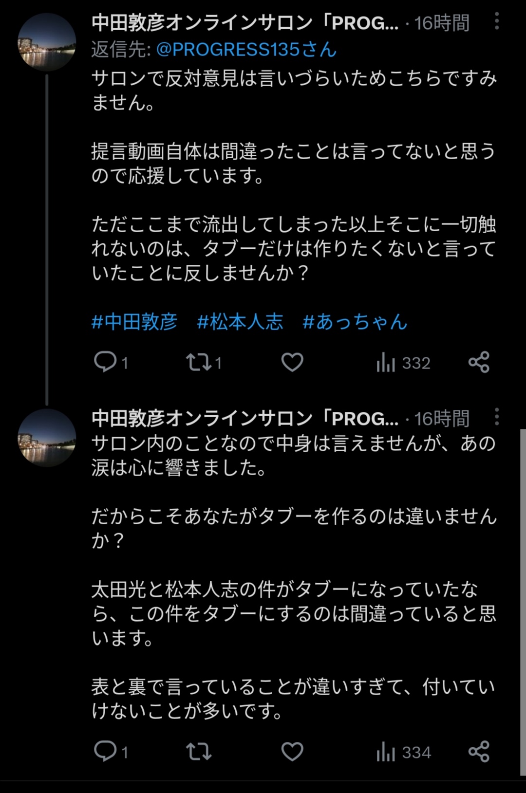 中田敦彦のオンラインサロン、内部から造反者が出始める… Twitter Facebook はてブ LINE コピー 2023.06.14 スポンサーリンク 1: それでも動く名無し 2023/06/13(火) 10:35:07.75 ID:nzIfbrlB0 2: それでも動く名無し 2023/06/13(火) 10:35:29.74 ID:nzIfbrlB0 これ大丈夫か? 4: それでも動く名無し 2023/06/13(火) 10:37:01.80 ID:nzIfbrlB0 中田も結構ダメージ受けてそうやな 続きを読む