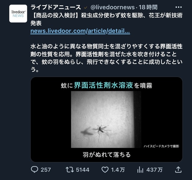 【朗報】蚊を飛べなくする新兵器、発明されるwwwww Twitter Facebook はてブ LINE コピー 2023.06.21 スポンサーリンク 1: それでも動く名無し 2023/06/21(水) 14:39:36.18 ID:fVIdWoPQd すご∃ https://news.livedoor.com/article/detail/24463121/ 続きを読む