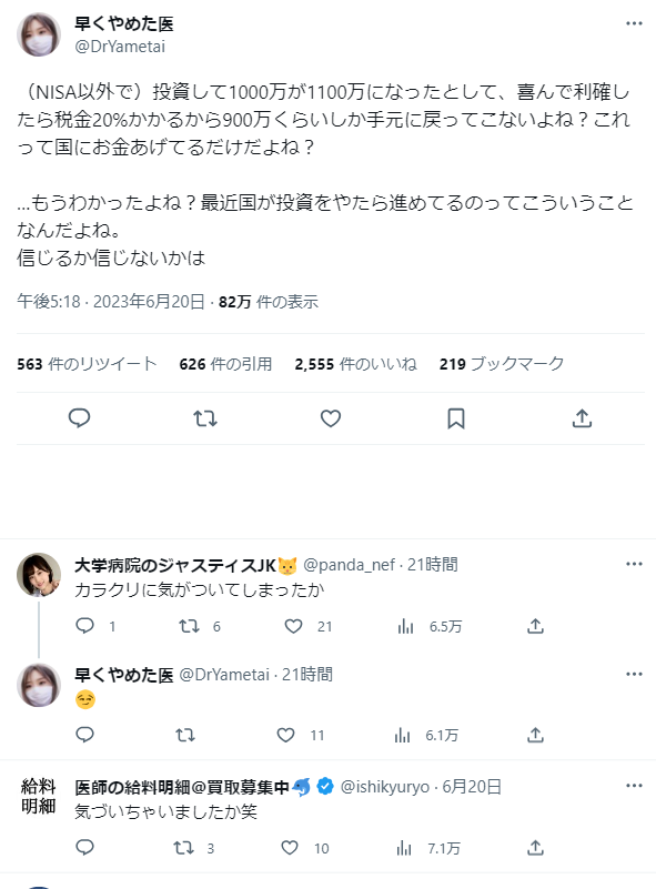 医師「株で1000万を1100万に増やしても税金取られて900万しか残らん。国が投資勧める理由はこれ」 Twitter Facebook はてブ LINE コピー 2023.06.21 スポンサーリンク 1: それでも動く名無し 2023/06/21(水) 18:06:21.02 ID:vhtjpHYd0 税金取りたい国にカモにされているという現実。 北島康介、新興宗教の布教に励んでいた 続きを読む