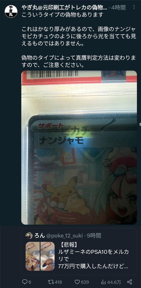 ポケモンカードもうメチャクチャ、偽造が凄すぎて鑑定品を鑑定する必要が出てくる (※画像あり) Twitter Facebook はてブ LINE コピー 2023.06.22 スポンサーリンク 1:それでも動く名無し:2023/06/22(木) 11:30:28.42 ID:cZWL3Gptd https://i.imgur.com 2:それでも動く名無し:2023/06/22(木) 11:30:45.68 ID:cZWL3Gptd えぇ… 3:それでも動く名無し:2023/06/22(木) 11:31:00.17 ID:z6LqOniqd 鑑定とは 続きを読む