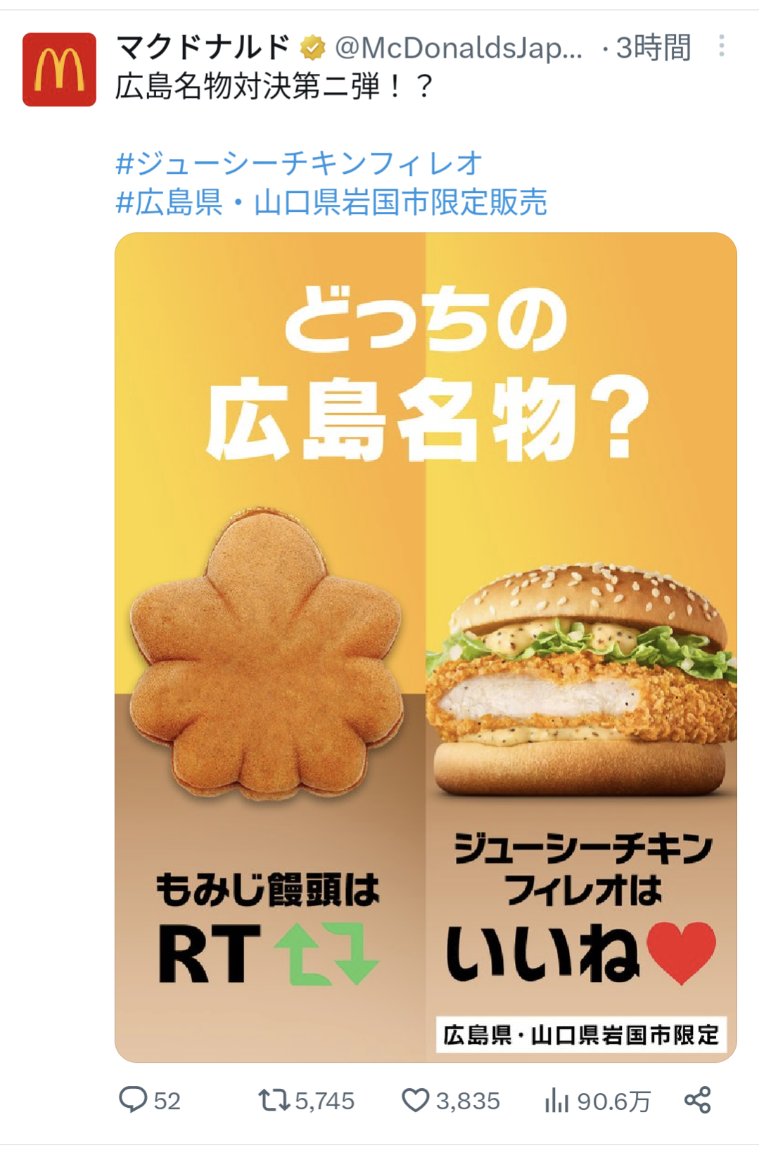 広島名物対決第ニ弾!?#ジューシーチキンフィレオ#広島県・山口県岩国市限定販売 pic.twitter.com/Qe2VRYytDh
