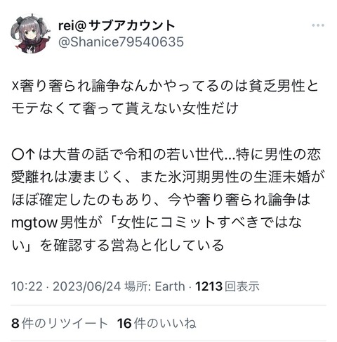 【悲報】バカ「奢り奢られ論争は奢れない弱者男性と奢られない非モテ女の争い」有識者「それは違うぞ」 Twitter Facebook はてブ LINE コピー 2023.06.24 スポンサーリンク 1:風吹けば名無し:2023/06/24(土) 12:22:53.87 ID:tNgEqNyVp.net これが現実 お前らもいい加減脳みそをアップデートすべきやねんな 続きを読む