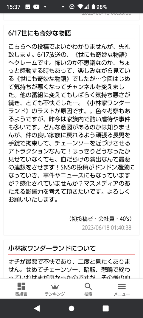 【悲報】フジテレビさん、2023年夏放送の世にも奇妙な物語でやらかしてしまう Twitter Facebook はてブ LINE コピー 2023.07.02 スポンサーリンク 1:風吹けば名無し:2023/07/02(日) 15:39:32.04 2作目「小林家ワンダーランド」のオチがひどすぎると視聴者からのクレームが殺到した模様 続きを読む