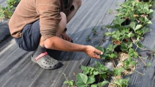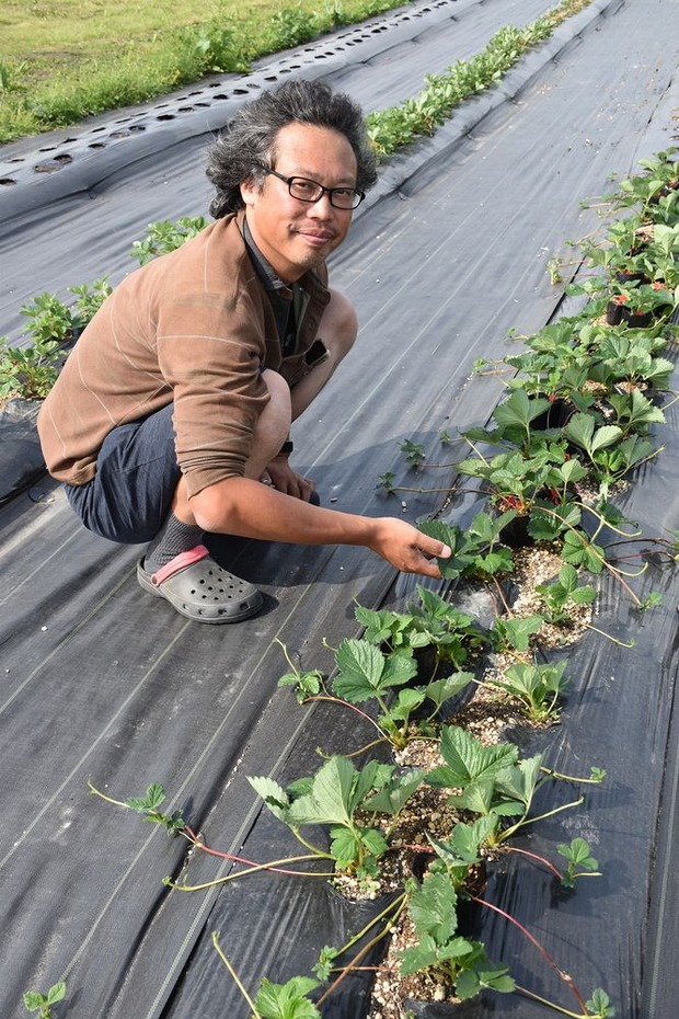 【余市】お笑い芸人だった男性が、生まれ故郷の余市町に戻り、イチゴ栽培に励んでいる。元「おにぎり」の片桐健雄さん(45)。1年間の農業研修を経て、3~4月に種や苗を植えたイチゴは青々とした葉を実らせ、秋の収穫を待ち望んでいる。「今が一番充実している」と農作業に精を出している。