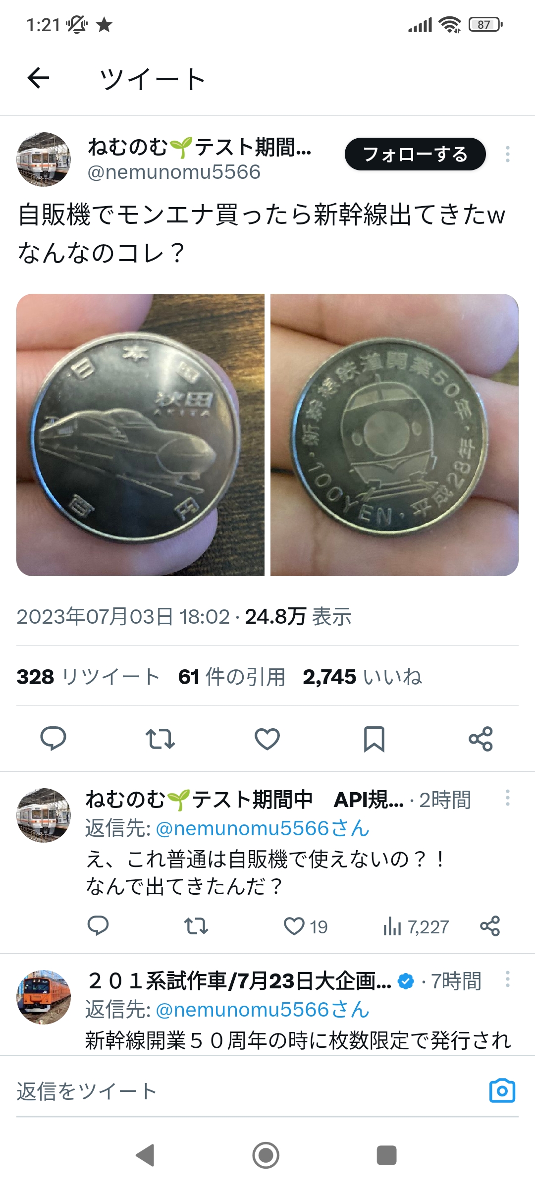 撮り鉄「自販機でモンエナ買ったらお釣りで新幹線の記念100円硬貨出てきました。」←炎上 Twitter Facebook はてブ LINE コピー 2023.07.04 スポンサーリンク 1:2023/07/04(火) 01:22:36.67 ID:tCm9eXWs0草転載元スレッド:https://eagle.5ch.net/test/read.cgi/livejupiter/1688401356/ 続きを読む